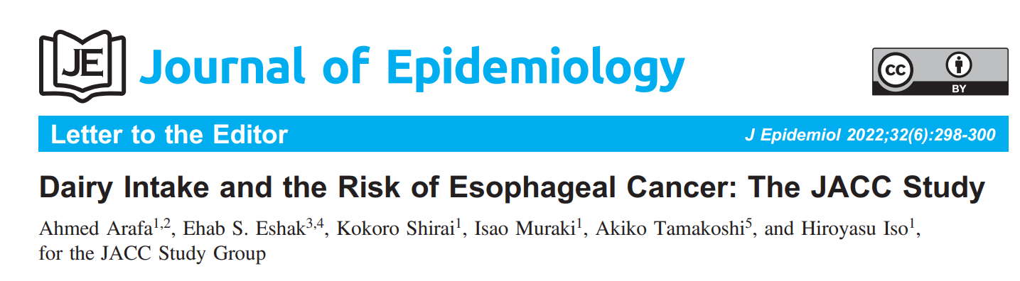 Arafa A, Eshak ES, Shirai K, Muraki I, Tamakoshi A, Iso H. Dairy Intake and the Risk of Esophageal Cancer: The JACC Study. J Epidemiol. 2022;32(6):298-300. doi:10.2188/jea.JE20220037.