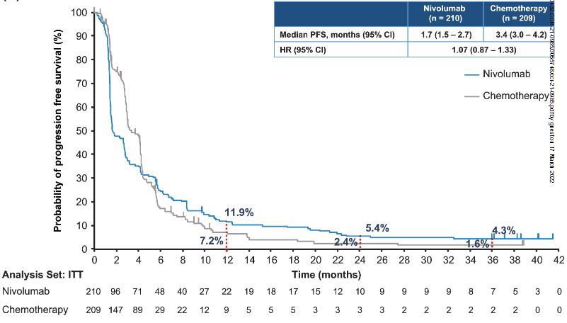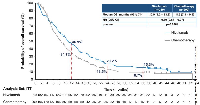 共招募了419位患者:納武單抗組 210位,化療組 209位。截止2020年5月25日,最短隨訪了36.0個月,與化療組相比,納武單抗組的總生存期明顯更長(中位總生存期:10.9 vs 8.5個月;HR 0.79,p=0.0264);納武單抗組和化療組的三年總生存率分別是15.3%和8.7%。無論是否獲得緩解,納武單抗組的中位總生存期均長于化療組:完全或部分緩解:19.9 vs 15.4個月;病情穩(wěn)定:17.4 vs 8.8個月;病情進(jìn)展:7.6 vs 4.2個月。
