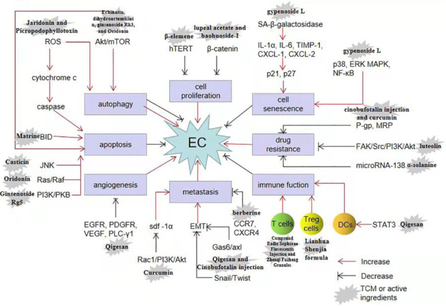 綜上所述,中醫藥治療EC顯示出巨大潛力。由于其天然的復雜性,它非常適合 EC 的復雜機制。然而,也存在一個更廣泛的困境:由于中醫藥的靶點和途徑多,大多數中草藥的抗 EC 機制尚未完全闡明。有必要借助多學科、大樣本、多組學的技術,探索與中醫藥機制相關的調控網絡。同時,由于缺乏高質量的循證研究,中醫藥在制定EC臨床路徑和指南方面處于劣勢,極大地限制了中醫藥的應用和發展。未來,需要在多個中心進行具有更大樣本量的高質量隨機臨床試驗來改善這一點。