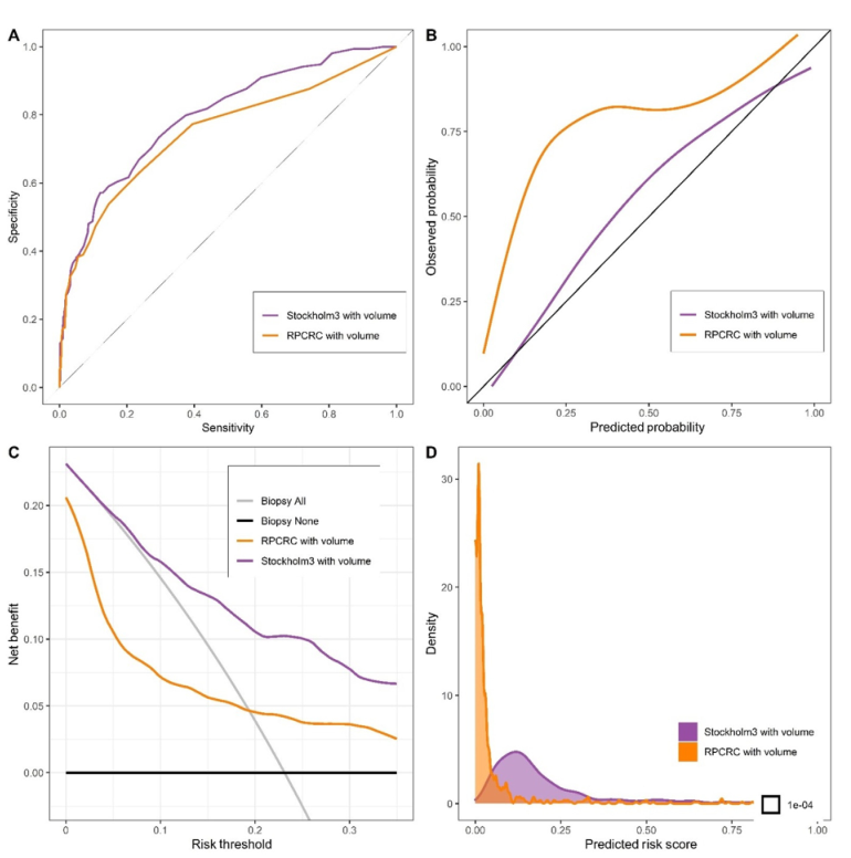 研究人員采用了前瞻性、基于人群的隨機STHLM3-MRI篩查試驗的數據,將前列腺特異性抗原(PSA)≥3 ng/ml或Stockholm3風險閾值≥11%的參與者納入標準組,并進行系統性前列腺活檢。使用RPCRC和Stockholm3計算了每個參與者的臨床顯著性前列腺癌(csPC,國際泌尿外科病理學會等級≥2級)的概率。通過鑒別能力、校準和臨床效益,評估了風險計算工具的性能。