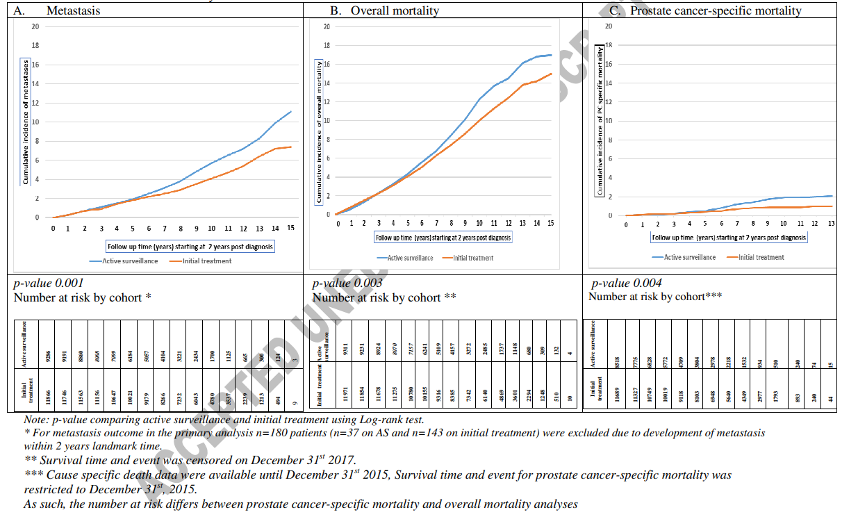 綜上所述,這項以群體為基礎(chǔ)的低等級PC男性長期結(jié)果研究中,AS與良好的長期MFS和OS相關(guān)。然而,長期的CSS略差(AS患者10年的惡化多1%),因而需要與過度治療危害進(jìn)行平衡。