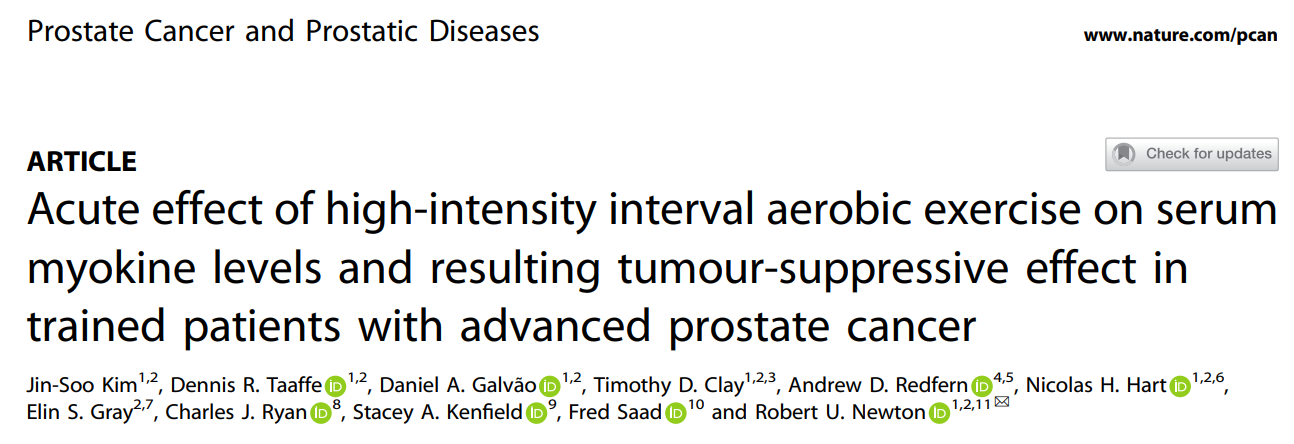 Jin-Soo Kim, Dennis R Taaffe, Daniel A Galvão et al. Acute effect of high-intensity interval aerobic exercise on serum myokine levels and resulting tumour-suppressive effect in trained patients with advanced prostate cancer. Prostate Cancer Prostatic Dis. Nov 2022