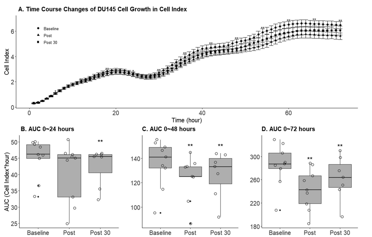 結(jié)果發(fā)現(xiàn),與基線相比,運(yùn)動后立即收集的血清中SPARC(19.9%,P=0.048)、OSM(11.5%,P=0.001)、IL-6(10.2%,P=0.02)和IL-15(7.8%,P=0.023)明顯升高;休息30分鐘后恢復(fù)到基線水平。與運(yùn)動前血清相比,運(yùn)動后立即獲得的血清和運(yùn)動后30分鐘獲得的血清可引起DU-145細(xì)胞生長和細(xì)胞指數(shù)面積減少(對于運(yùn)動后立即獲得血清,72小時的細(xì)胞指數(shù):16.9%,P<0.001;曲線下面積:15.2%,P<0.001;對于運(yùn)動后30分鐘獲得血清:72小時的細(xì)胞指數(shù):6.5%;曲線下面積:8.8%,P<0.001)。