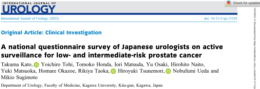 Takuma Kato, Yoichiro Tohi, Tomoko Honda et al. A national questionnaire survey of Japanese urologists on active surveillance for low- and intermediate-risk prostate cancer. Int J Urol. Nov 2022