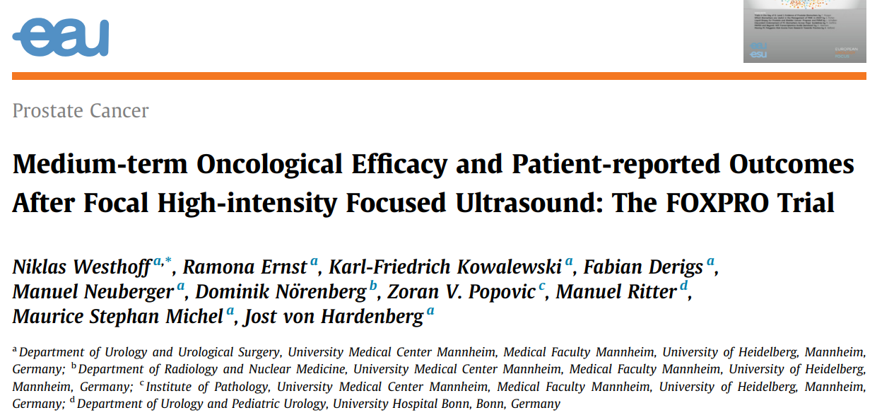 Niklas Westhoff , Ramona Ernst, Karl-Friedrich Kowalewski et al. Medium-term Oncological Efficacy and Patient-reported Outcomes After Focal High-intensity Focused Ultrasound: The FOXPRO Trial. Eur Urol Focus. Nov 2022