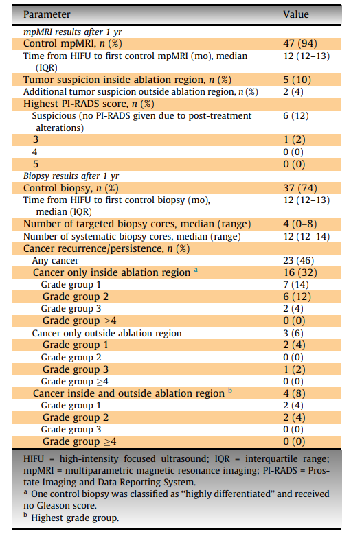 研究為前瞻性的單中心隊列研究設計,于2014年至2020年進行。研究納入了那些通過MRI/TRUS融合和系統性前列腺活檢、ISUP分級組(GG)≤2,且前列腺特異性抗原(PSA)<10 ng/ml的患者。研究的干預措施為MRI/TRUS融合引導下的局部HIFU治療。研究的主要結果是經HIFU治療1年后,病灶活檢的無癌率。次要終點包括無救治生存率(STFS)、無轉移生存率(MFS)、總生存率(OS),以及根據國際健康結果測量聯合會建議的PROMs。