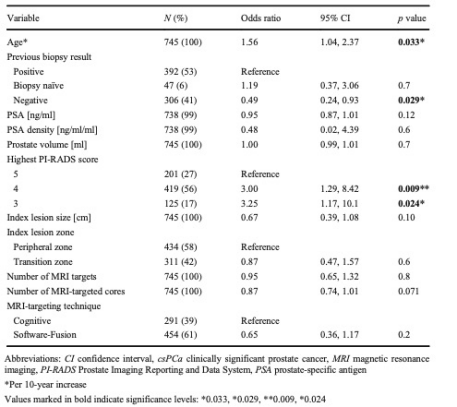 表 聯合活檢與MRI靶向活檢升級為csPCa的關系的單變量分析