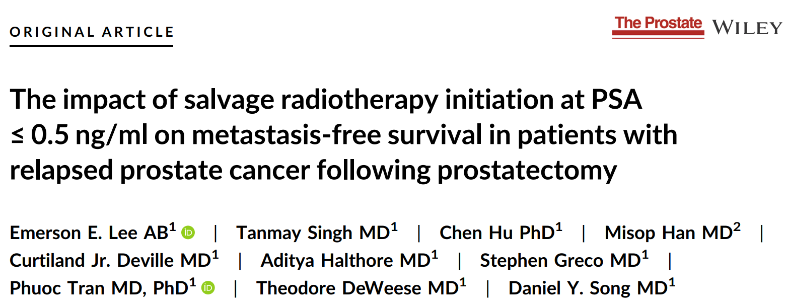 Emerson E Lee, Tanmay Singh, Chen Hu et al. The impact of salvage radiotherapy initiation at PSA ≤ 0.5 ng/ml on metastasis-free survival in patients with relapsed prostate cancer following prostatectomy. Prostate. Oct 2022