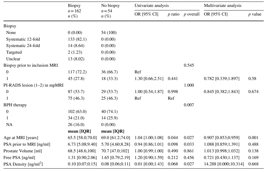 2018年至2020年期間,研究人員共對216名懷疑有PCa但mpMRI陰性(PI-RADS≤2)的患者進行了電話訪談,了解其結果并進一步隨訪。臨床顯著性PCa(csPCa)定義為ISUP≥2。研究人員還對有無活檢的患者和有無PCa的患者進行了比較,并進行單變量和多變量分析,來評估mpMRI陰性患者發生PCa的預測因素。