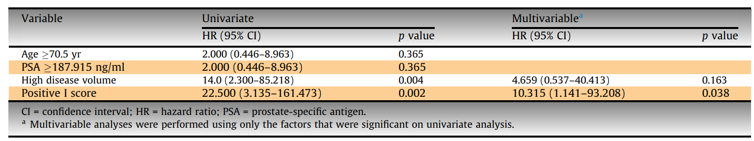 在22名IScore為陽性的患者中,86.4%(19/22)的患者有轉(zhuǎn)移性前列腺癌。在這19例中,94.7%(18/19)的患者為mHSPC,其中83.3%(15/18)為高負荷mHSPC。 局部前列腺癌患者中沒有1例的IScore 是陽性的。IScore 陽性組mHSPC患者的TTP明顯短于IScore 陰性組(16.4 vs 36.9個月; p=0.001)。另外,只有IIScore 可以獨立預(yù)測mCRPC的進展(危險比為10.315,95%置信區(qū)間為1.141-93.208;p=0.038)。