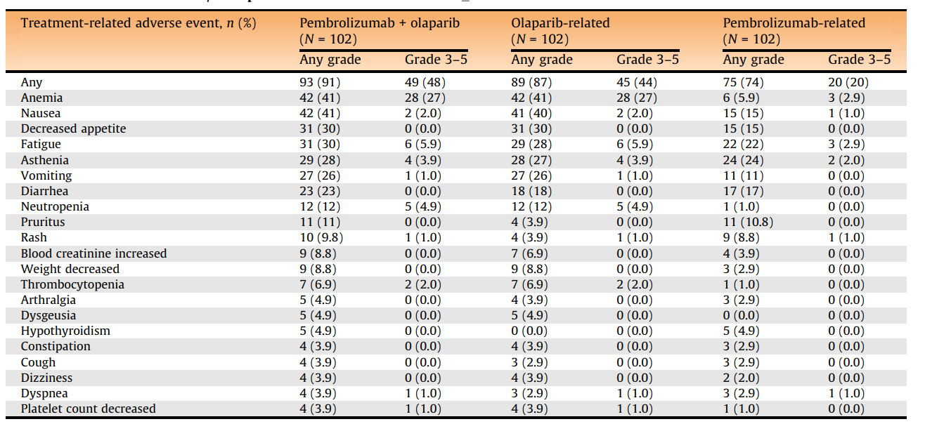 在104名入組患者中,102人接受了治療。治療群體的中位年齡為70歲(四分位數(shù)范圍[IQR],65-76)。根據(jù)RECIST v1.1,59名患者(58%)有可測量的疾病。治療群體從第一次用藥到截止的中位時(shí)間為24月(IQR,22-47)。治療群體的反應(yīng)率為15%。對于有可測量疾病的患者,ORR為8.5%(五個(gè)部分反應(yīng))。治療群體的中位rPFS為4.5個(gè)月(95%置信區(qū)間[CI],4.0-6.5),中位OS為14個(gè)月(95% CI,10.4-18.2)。另外,臨床活性在程序性死亡配體1(PD-L1)陽性和同源重組修復(fù)突變亞組中是一致的。93名患者(91%)發(fā)生了治療相關(guān)的不良事件(TRAEs)。49名患者(48%)發(fā)生了3-5級的TRAEs。6例死亡(5.9%)是由不良事件引起的;2例(心肌梗死和原因不明)是由治療引起的。該研究的局限性包括了單臂設(shè)計(jì)。