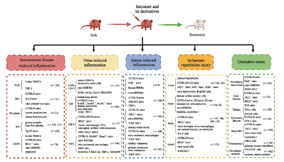 衣康酸在不同炎癥和氧化應(yīng)激誘導(dǎo)的疾病中的作用,以及在這些引用的研究中使用的動(dòng)物和細(xì)胞模型