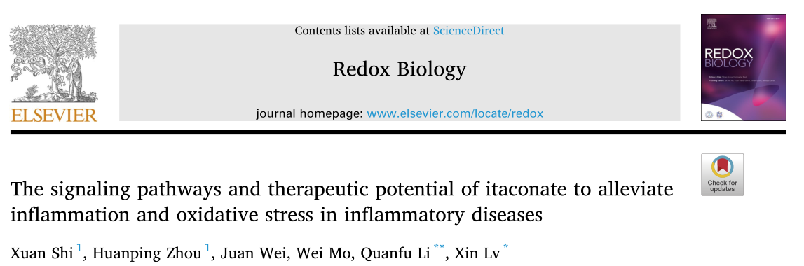 Xuan Shi et al. The signaling pathways and therapeutic potential of itaconate to alleviate inflammation and oxidative stress in inflammatory diseases. Redox Biol. 2022 Dec;58:102553. doi: 10.1016/j.redox.2022.102553