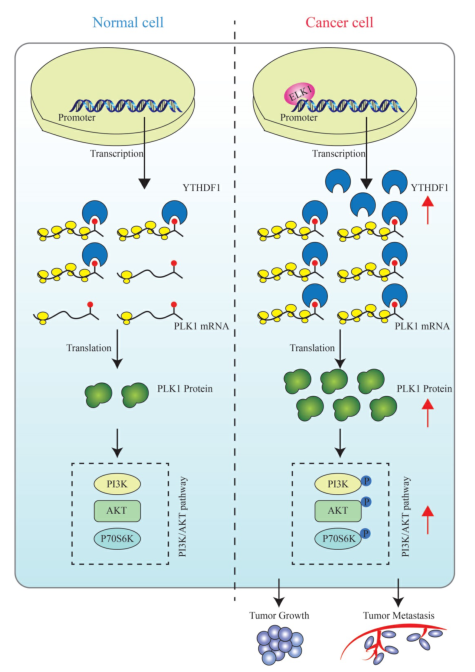 研究者證明了Polo-like kinase1(PLK1)是YTHDF1的直接靶標。YTHDF1通過鑒定m6A修飾的PLK1mRNA促進PLK1的翻譯效率,并隨后促進PI3K/AKT信號通路的過度激活。此外,我們的結果表明YTHDF1在前列腺癌組織中表達上調,并且YTHDF1的高表達與前列腺癌患者的不良預后有關。