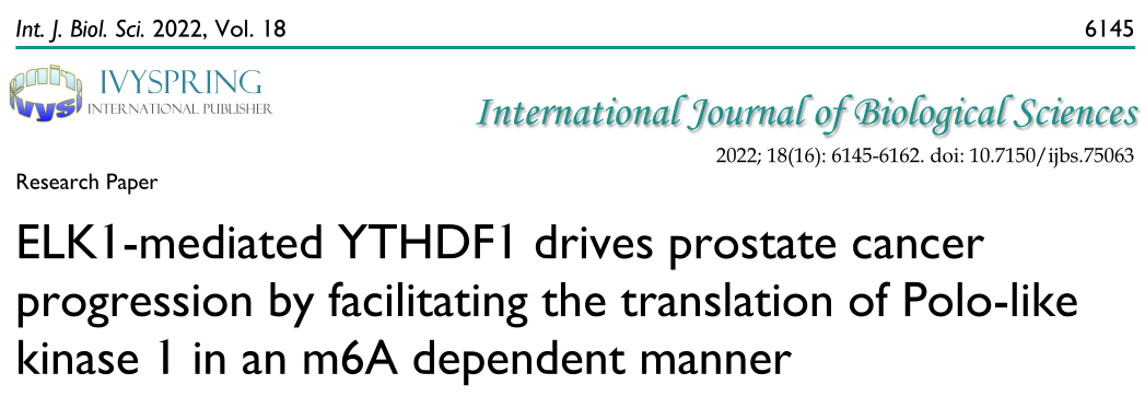Peizhang Li et al. ELK1-mediated YTHDF1 drives prostate cancer progression by facilitating the translation of Polo-like kinase 1 in an m6A dependent manner. Int J Biol Sci. 2022 Oct 18;18(16):6145-6162. doi: 10.7150/ijbs.75063.