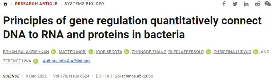 Rohan Balakrishnan et al. Principles of gene regulation quantitatively connect DNA to RNA and proteins in bacteria. Science, 2022, doi:10.1126/science.abk2066.