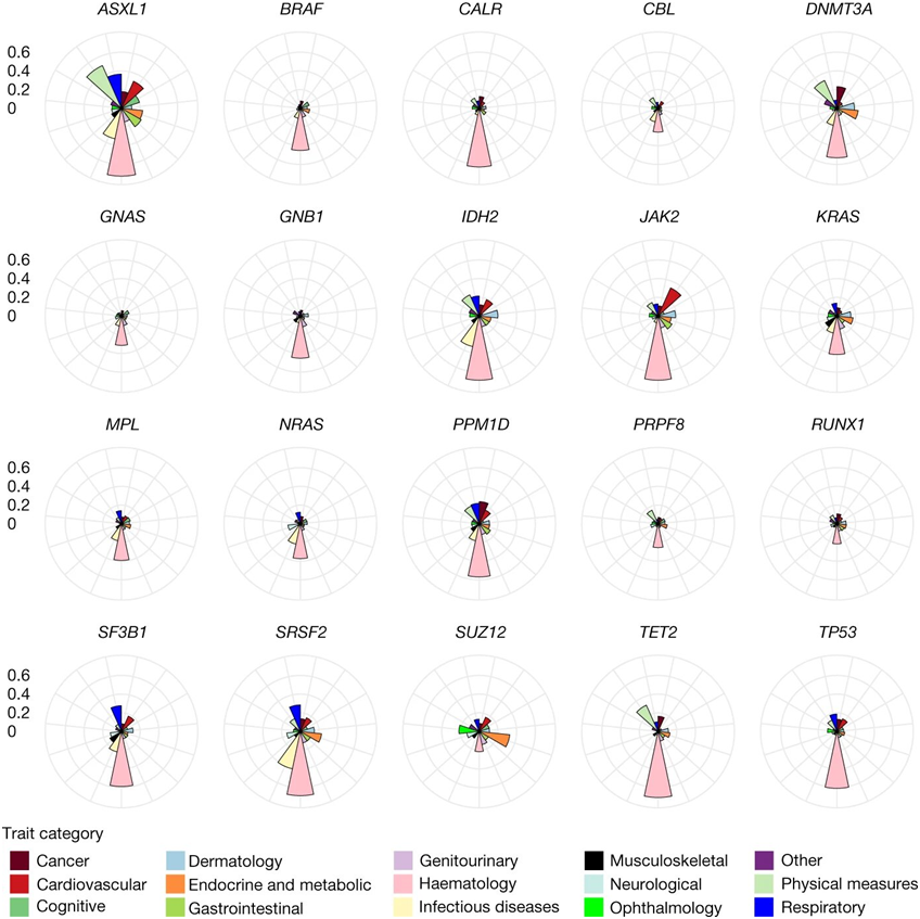 每種CHIP亞型的表型組關聯圖譜。圖片來自Nature, 2022, doi:10.1038/s41586-022-05448-9。