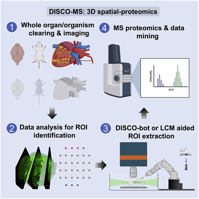 一旦確定了感興趣的區域,就可以使用一種名為DISCO-bot的新機器人技術將其分離出來,該技術由機械工程師Furkan Öztürk(Ertürk實驗室的一名博士生)開發。使用Mann實驗室前博士生Andreas-David Brunner開發的先進質譜(MS)方法,對機器人輔助提取的組織進行處理,以進行蛋白質組分析。這種高科技方法允許對整個小鼠身體或人類器官中三維確定的任何所需組織區域進行完整的分子特征分析。