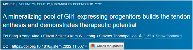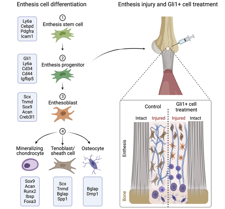 Fei Fang et al. A mineralizing pool of Gli1-expressing progenitors builds the tendon enthesis and demonstrates therapeutic potential. Cell Stem Cell, 2022, doi:10.1016/j.stem.2022.11.007.