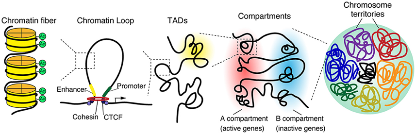 三維基因組結構,圖片來自Frontiers in Cell and Developmental Biology, 2021, doi:10.3389/fcell.2020.626541。