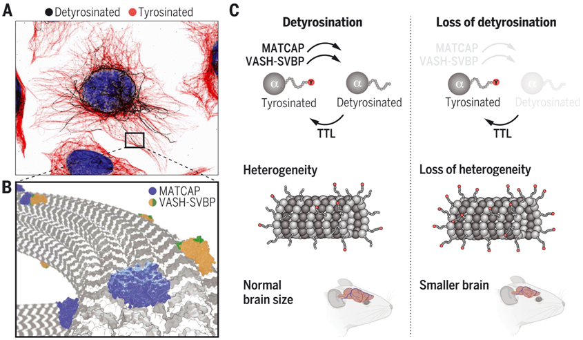 微管蛋白去酪氨酸化是由不同的MATCAP和vasohibin去酪氨酸酶進行的。圖片來自Science, 2022, doi:10.1126/science.abn6020。