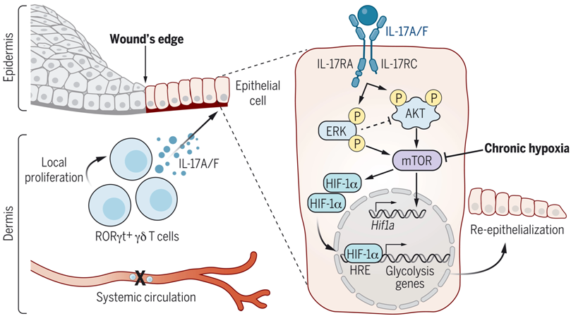 上皮修復需要細胞通過進化上保守的缺氧誘導因子(hypoxia-inducible factor, HIF)來適應缺氧的傷口微環(huán)境。長期以來,人們認為這種反應取決于上皮細胞對缺氧的自主感應和通過HIF的反應能力。然而,在上皮修復過程中,來自免疫細胞的支持性微環(huán)境信號是否以及如何與古老的缺氧反應相互作用,還有待于探索。為了解決這些問題,來自美國紐約大學的研究人員在一項新的研究中著重關注一類主要的上皮屏障---皮膚,它受到免疫細胞的監(jiān)視,并已進化出復雜的修復機制。相關研究結果發(fā)表在2022年7月8日的Science期刊,論文標題為“Interleukin-17 governs hypoxic adaptation of injured epithelium”。