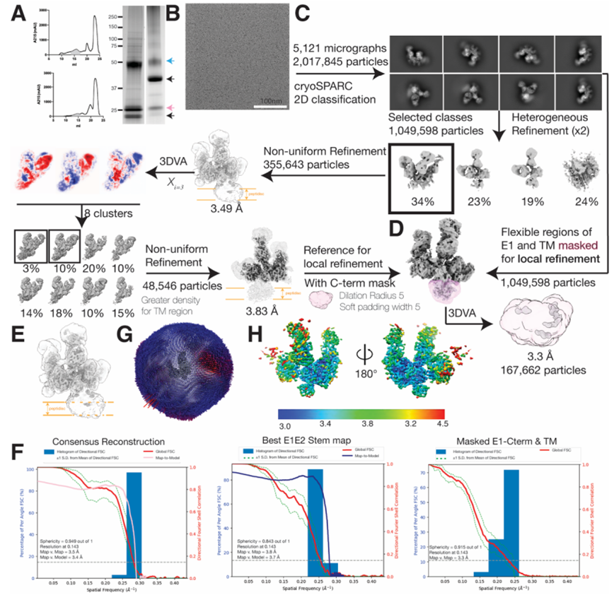 全長HCV包膜糖蛋白E1E2異源二聚體與廣泛中和抗體AT1209、IGH505和AR4A結合在一起時的低溫電鏡處理流程。圖片來自Science, 2022, doi:10.1126/science.abn9884。