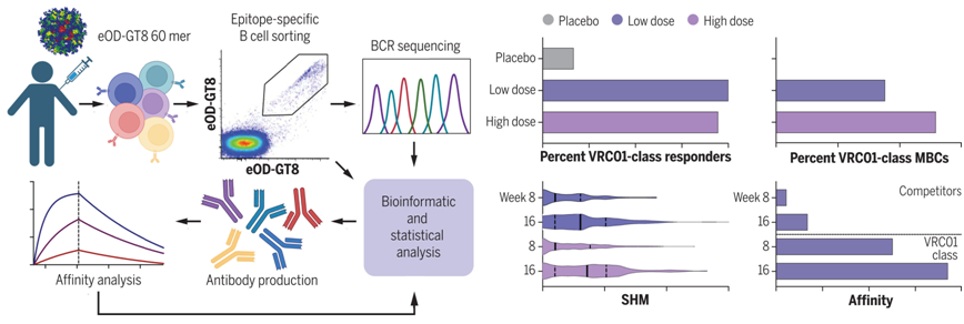 這項新研究測試的一種實驗性HIV疫苗被稱為eOD-GT8 60mer。它是一種能引起免疫反應的工程化免疫原。它被設計用來刺激和擴大某些罕見的有潛力產生抗擊HIV的bnAb抗體的B細胞。