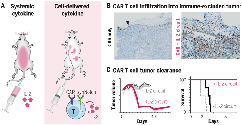 這些作者察到他們設計的synNotch誘導IL-2產生的回路(下稱synNotch→IL-2回路)促使嵌合抗原受體(CAR)或TCR T細胞有效地浸潤到胰腺癌和黑色素瘤的免疫抑制性腫瘤模型中。在這些具有挑戰(zhàn)性的免疫功能的腫瘤模型中,這種浸潤的改善與腫瘤清除率和生存率的大幅提高有關。與全身遞送IL-2不同,這種局部的IL-2回路不顯示毒性,因為它不依賴于TCR/CAR的激活,但仍靶向腫瘤。