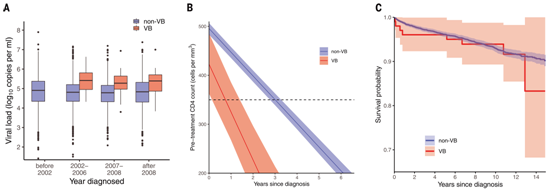 在接受抗逆轉錄病毒治療(ART)之前,感染了這種VB變體的人與感染了其他HIV變體的人相比顯示出明顯的差異:(1)感染VB變體的人的病毒載量(血液中的病毒水平)高出3.5到5.5倍;(2)此外,感染VB變體的人體內CD4 T細胞減少的速度(這是HIV對免疫系統(tǒng)造成損害的標志)比其他HIV變體快兩倍,使這些感染者更快面臨發(fā)展為艾滋病(AIDS)的風險;(3)感染VB變體的人還顯示出將這種病毒傳播給他人的風險增加。