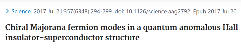 2017年7月21日,加州大學洛杉磯分校的研究人員在“Science”國際頂級期刊上發表了一篇題為“Chiral Majorana fermion modes in a quantum anomalous Hall insulator-superconductor structure”的研究論文,研究結果表明,在量子反常霍爾絕緣體薄膜與超導體耦合的混合系統中存在一維手性馬約拉納費米子模。