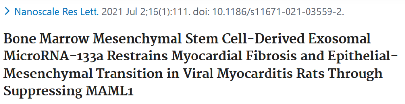 2021年7月2日,浙江大學醫學院第四附屬醫院的研究人員在“Nanoscale Research Letters”期刊在線發表了題為“Bone Marrow Mesenchymal Stem Cell-Derived Exosomal MicroRNA-133a Restrains Myocardial Fibrosis and Epithelial-Mesenchymal Transition in Viral Myocarditis Rats Through Suppressing MAML1”的研究論文,結果表明外泌體miR-133a通過下調MAML1抑制病毒性心肌炎大鼠心肌纖維化和上皮細胞-間質細胞的轉化,從而抑制心肌炎的進展。