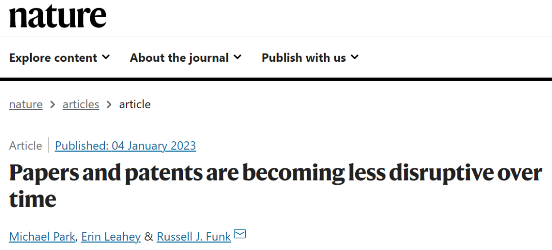 2023年1月4日,美國明尼蘇達大學和亞利桑那大學的研究人員在國際頂尖學術期刊 Nature 發表了題為:Papers and patents are becoming less disruptive over time 的研究論文。