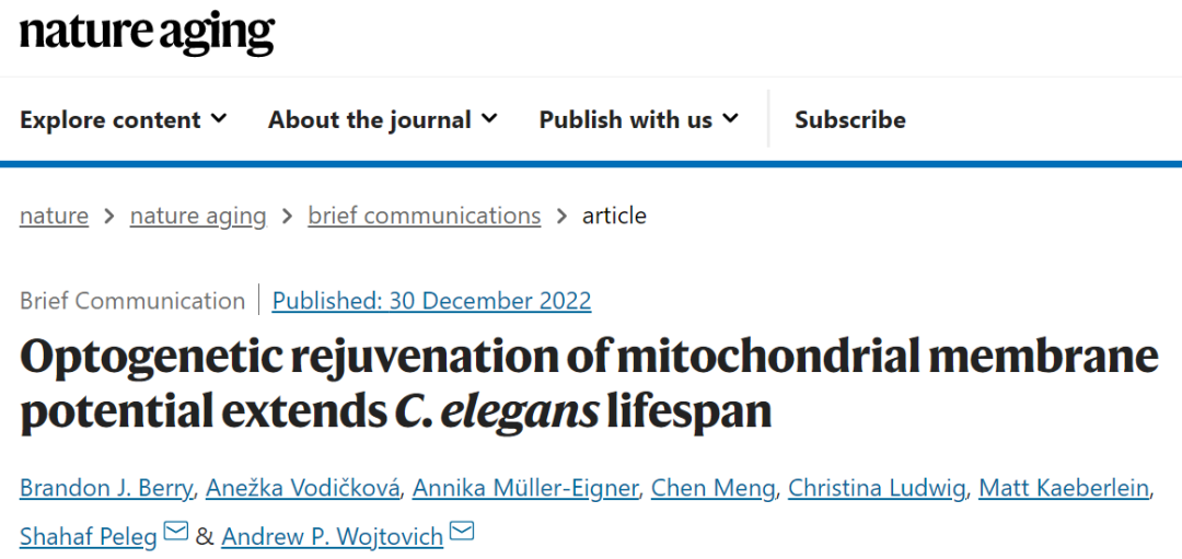 近日,羅切斯特大學(xué)醫(yī)學(xué)中心、德國農(nóng)場動物生物學(xué)研究所、華盛頓大學(xué)、慕尼黑工業(yè)大學(xué)的研究人員合作,在 Nature 子刊 Nature Aging 上發(fā)表了題為:Optogenetic rejuvenation of mitochondrial membrane potential extends C. elegans lifespan 的研究論文。