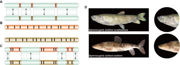 圖1.(A-C)同域,異域和鄰域物種形成的基因流模式;(D)兩種裸鯉魚示意圖