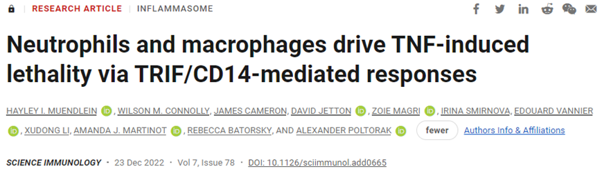 Hayley I. Muendlein et al. Neutrophils and macrophages drive TNF-induced lethality via TRIF/CD14-mediated responses. Science Immunology, 2022, doi:10.1126/sciimmunol.add0665.