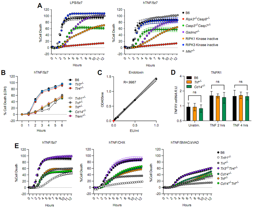 首先,他們確定了哪些特定的分子可能阻止TNF誘導的死亡。當他們給小鼠注射致命劑量的TNF時,他們發現缺乏TRIF或CD14的小鼠,這兩種蛋白通常與對細菌LP的免疫反應有關。