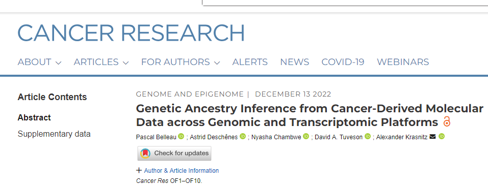 Pascal Belleau,Astrid Deschênes,Nyasha Chambwe, et al. Genetic Ancestry Inference from Cancer-Derived Molecular Data across Genomic and Transcriptomic Platforms, Cancer Research (2022). DOI: 10.1158/0008-5472.CAN-22-0682