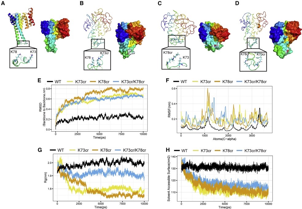 接下來,研究人員通過賴氨酸巴豆酰化修飾蛋白質組學鑒定到了一系列受亮氨酸調控的巴豆酰化修飾蛋白。通過生物信息學數據及驗證試驗,進一步發現14-3-3ε 蛋白的K73和K78巴豆酰化修飾可能在亮氨酸饑餓誘導自噬過程中發揮重要作用。14-3-3ε蛋白巴豆酰化缺失突變K73R和K78R可顯著抑制細胞自噬過程的發生。通過14-3-3ε蛋白巴豆酰化修飾分子動力學模擬試驗,K73和K78巴豆酰化修飾可顯著增加蛋白質分子構象不穩定性,使蛋白質分子二級結構處于一種無序的狀態。
