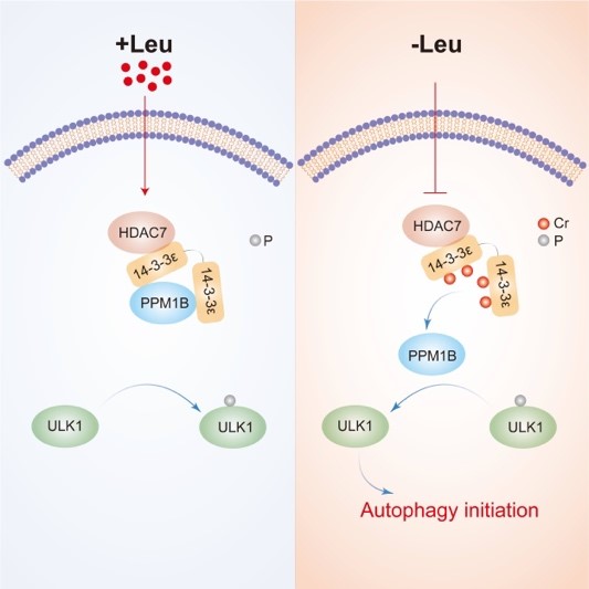 近日,農業微生物學全國重點實驗室、湖北洪山實驗室、華中農業大學動物育種與健康養殖前沿科學中心晏向華教授團隊研究成果以“Lysine crotonylation regulates leucine-deprivation-induced autophagy by a 14-3-3ε-PPM1B axis”為題在Cell Reports發表,研究揭示了亮氨酸通過賴氨酸巴豆酰化修飾途徑調節自噬起始過程的分子機制。