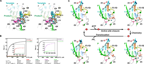 中國(guó)科學(xué)院武漢病毒研究所研究員龔鵬團(tuán)隊(duì)長(zhǎng)期從事病毒RdRP催化機(jī)制研究。近期,該團(tuán)隊(duì)通過在腸道病毒71型(enterovirus 71,EV71)RdRP-RNA復(fù)合物晶體浸泡實(shí)驗(yàn)中的多方嘗試,解析了高度接近催化反應(yīng)發(fā)生狀態(tài)的RdRP晶體結(jié)構(gòu)(圖A,PDB編號(hào):7W9S,分辨率2.5埃),發(fā)現(xiàn)位于RdRP基序D附近的一個(gè)賴氨酸殘基K360與結(jié)構(gòu)中底物CTP的g-磷酸存在近距離相互作用(3.3埃)。在與EV71同為腸道病毒的脊髓灰質(zhì)炎病毒的前期研究中,等同的K359殘基被認(rèn)為直接參與催化反應(yīng)和其中的質(zhì)子轉(zhuǎn)移過程,而上述晶體結(jié)構(gòu)中觀測(cè)到的近距離相互作用進(jìn)一步提示了這種可能性。據(jù)此,該團(tuán)隊(duì)選取了EV71 RdRP的K360殘基和另一個(gè)與CTP的磷酸基團(tuán)存在相互作用的基序F精氨酸殘基R174為突變位點(diǎn)設(shè)計(jì)了系列突變體,利用酶學(xué)方法對(duì)野生型RdRP和突變體的單步延伸速率常數(shù)和CTP米氏常數(shù)(圖B)、RdRP延伸狀態(tài)(elongation)和延伸前狀態(tài)(pre-elongation)下催化的pH依賴性等多種參數(shù)和性質(zhì)進(jìn)行了表征。結(jié)果表明,K360位點(diǎn)的突變降低了催化效率,且在延伸和延伸前狀態(tài)下都能影響RdRP的pH依賴特性,而R174位點(diǎn)的突變所造成的影響與K360類似且能額外降低底物CTP的親和力。這些數(shù)據(jù)表明K360和R174均直接參與催化反應(yīng),但這兩個(gè)殘基是否直接參與質(zhì)子轉(zhuǎn)移有待進(jìn)一步取證。上述成果是該團(tuán)隊(duì)繼解析RdRP活性中心部分關(guān)閉結(jié)構(gòu)(對(duì)應(yīng)NAC步驟2)和揭示不對(duì)稱轉(zhuǎn)位現(xiàn)象(對(duì)應(yīng)NAC步驟4)(PNAS 2016;Nature Communications 2020)等NAC系列工作后的又一成果(對(duì)應(yīng)NAC步驟3),闡明了該循環(huán)的全過程機(jī)制(圖C、動(dòng)圖)。
