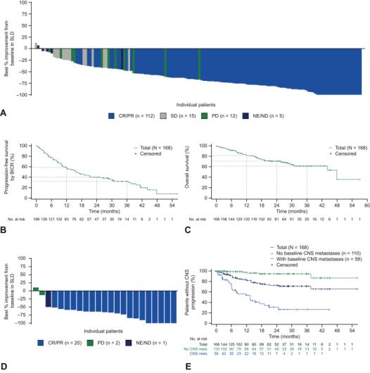 在 TRUST 中,克唑替尼初治患者的 ORR 為 92.5%,DCR 為 95.5%。克唑替尼預處理患者的 ORR 為 50.0%,DCR 為 78.9%。此外,在 5名 ROS1 G2032R 突變患者中,ORR 為 80%,其中 4 名達到部分反應,1 名達到穩定疾病。在具有可測量腦部病灶的患者中,顱內 ORR 為 91.7%,顱內 DCR 為 100%。兩個隊列均未達到中位 PFS。
