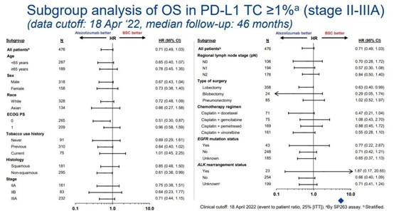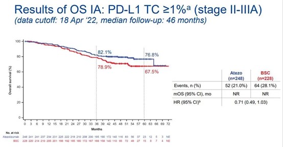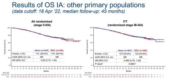 在臨床截止日期(2022年4月18日),中位隨訪時間為45個月,25.0%的患者死亡(ITT人群;N = 1005)。在PD-L1 TC≥1%的II-IIIA期患者中,觀察到阿替利珠單抗組的OS獲益傾向(OS HR=0.71)。