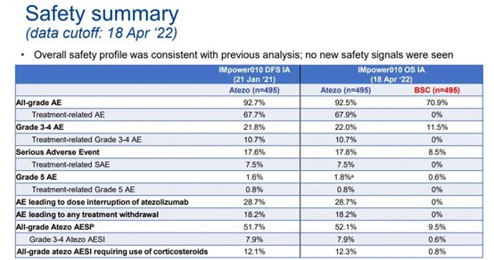 阿替利珠單抗組和BSC組患者中分別有22.0%和11.5%患者發生3-4級不良事件(AE),兩組的5級AE發生率為分別為 0.8%和0%。在接受阿替利珠單抗治療的患者中,52.1%發生特殊的AE;7.9%為3-4級,0.4%為5級(肺炎/間質性肺疾病和心肌炎)。DFS IA臨床截止日期后未發生新的5級AE。