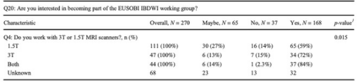 表 受訪者同時使用1.5T和3T掃描儀或僅使用3T掃描儀進行臨床工作與加入掃描儀工作組的意愿之間的關系