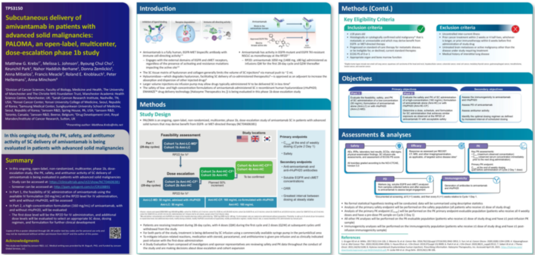 于2020年10月披露了一項amivantamab皮下注射劑型治療晚期實體惡性腫瘤的I期臨床研究(NCT04606381,PALOMA研究)。今年AACR大會上公布的I期的PALOMA研究結果顯示,amivantamab皮下注射劑型的使用,具有很好的療效和安全性。