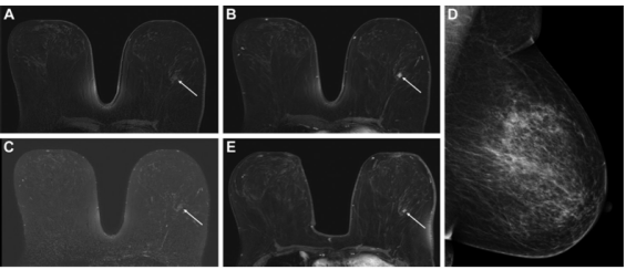 一位64歲的女性,在保乳手術后26個月(術后第二次核磁共振篩查)的簡略核磁共振檢查中發現同側乳腺腫瘤復發。(A)強化前和(B)強化后軸位T1加權MRI掃描顯示左乳外上方有一個0.7厘米的輕度強化的不規則腫塊(箭頭)。(C) 軸T2加權MRI掃描顯示腫塊(箭頭),信號強度為等信號,沒有瘤周水腫。(D) MRI檢查后的術前左側縱軸外側斜向乳房X線照片顯示無異常發現。(E)經回顧,1年前的MRI掃描上有一個病灶(箭頭)(術后第一次MRI篩查),但當時放射科醫生沒有注意到。在手術的組織病理學檢查中,該腫塊最終被證實為浸潤性導管癌(pT1N0,0.8厘米,三陰性,組織學分級高,Ki-67指數為70%)