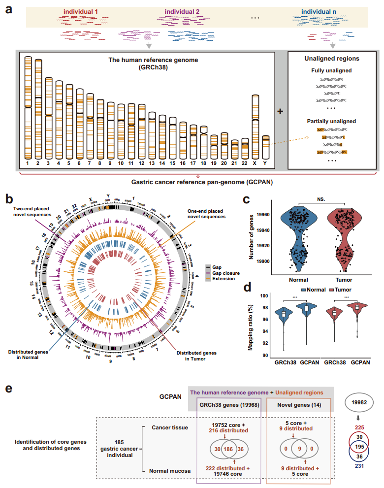 該研究首次將全新的泛基因組研究方法用于人類腫瘤基因組研究。通過構(gòu)建胃癌人群泛基因組,再以泛基因組作為參照將每一例全基因組測序數(shù)據(jù)予以比對,刻畫到胃癌個體基因組的存在-缺失新型變異。而那些與參考基因組無法匹配的序列中存在一組人類參考基因組中漏掉的新基因。研究成果為解析中國人胃癌高發(fā)的分子遺傳學(xué)背景提供了重要參考。