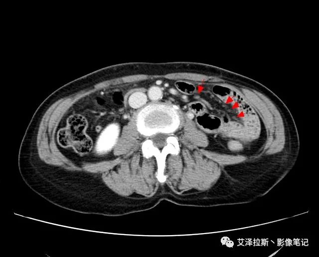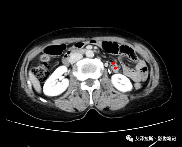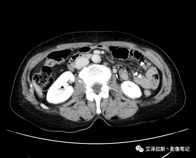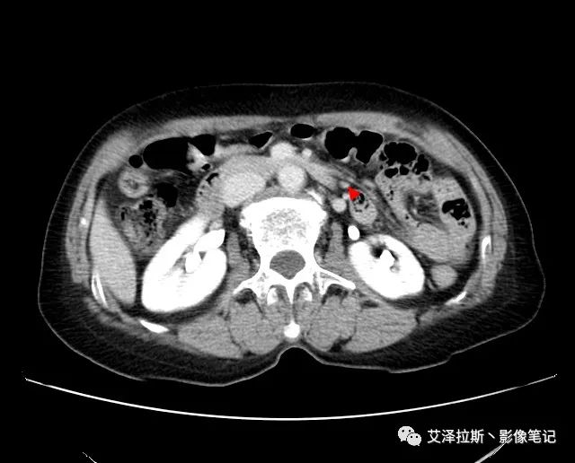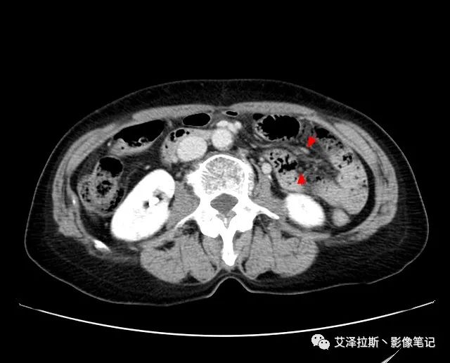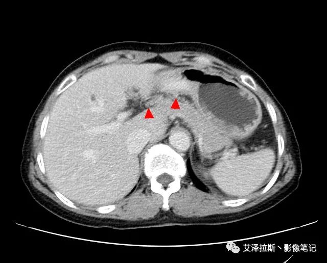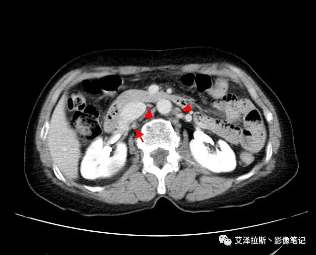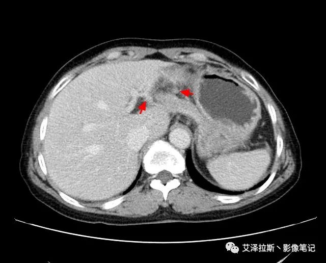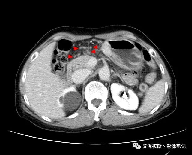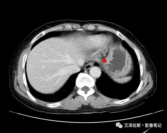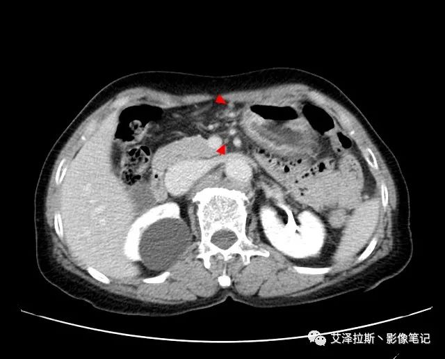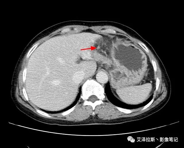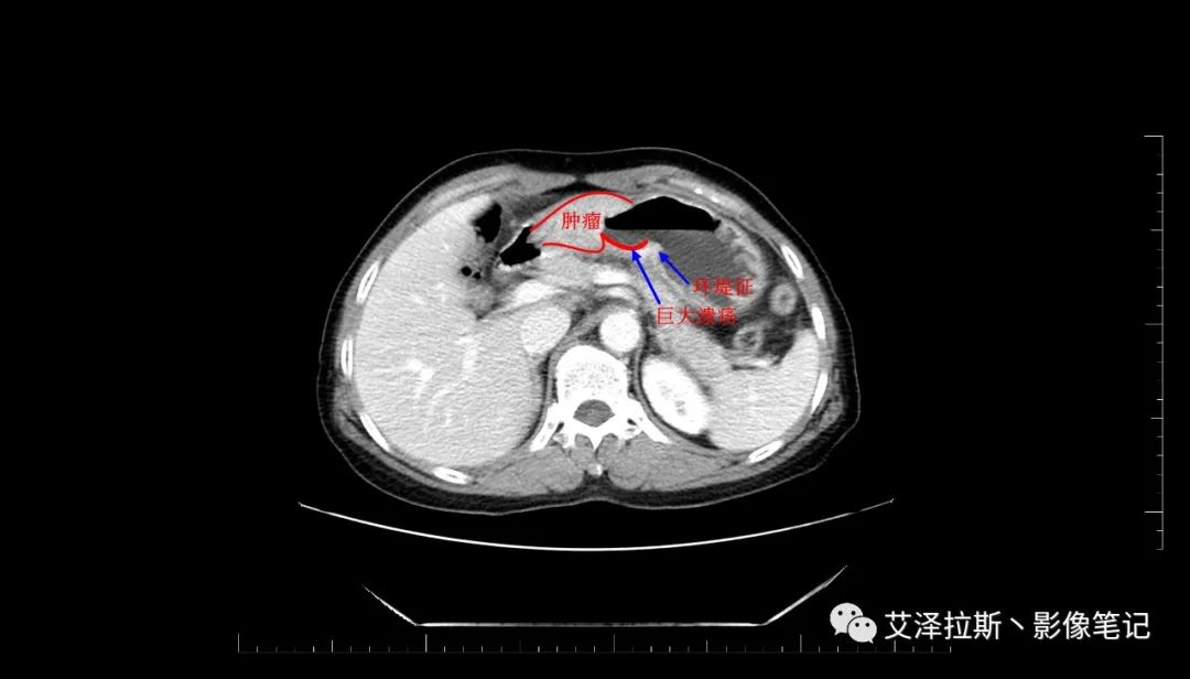 【影像所見】 胃竇部狹窄,胃壁環形增厚,小彎側見一巨大潰瘍,周圍伴“環堤征”,漿膜面不完整,胃周脂肪見網格狀條索影,病灶與肝臟左葉、胰腺鉤突脂肪間隙消失,增強掃描病灶明顯強化。引流區內約15個區域淋巴結受累。