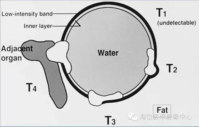 T2:胃壁增厚,低密度帶中斷,外輪廓光滑,周圍脂肪層清晰條索影少于1/3。
